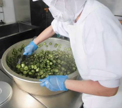 きゅうりの赤じそあえは、きゅうりを焼き物機で蒸し、赤じそや米酢で作った調味液であえています。