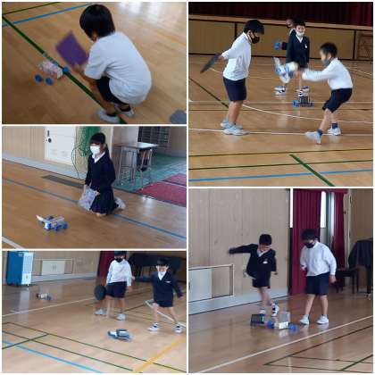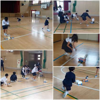 子ども達は、実際に講堂で「ヨットカー」を試走させ、いろいろと発見しています。