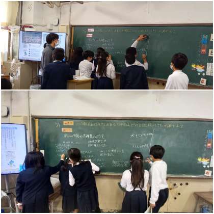 調べたことを黒板に書きだし、みんなで共有していきます。