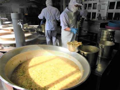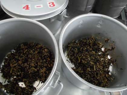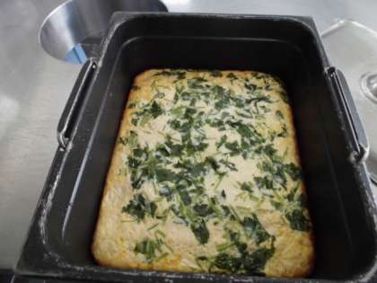 千草焼きは、卵に細かく刻んだ具を混ぜて焼いた料理です。給食の千草焼きは、だし・卵・ささみ・とうふ・コーンをミニバットに入れ、みつばをちらし、焼き物機で蒸し焼きにしています。