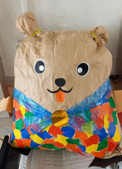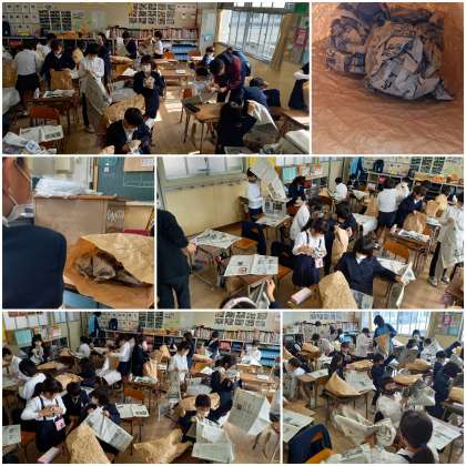全身の力を使って、新聞紙を「ぎゅぎゅ」としています。