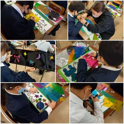 カッターナイフを使って形を切り取ったところに、カラーセロファンを貼り付けています。