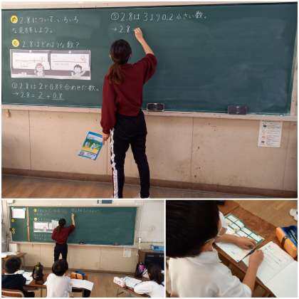2.8は、3より0.2小さい数など、小数をいろいろな表し方をしています。