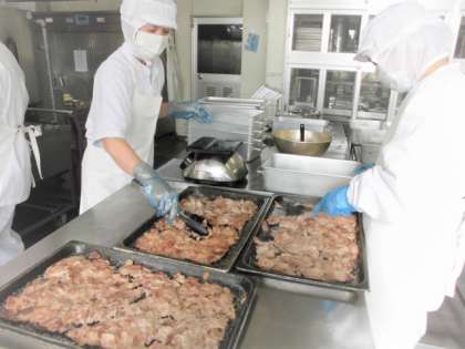 豚肉のガーリック焼きは、豚肉にワイン・塩・粗挽きこしょう・ガーリック・こいくちしょうゆ・オリーブ油で下味をつけ、焼き物機で焼いています。ガーリックと粗挽きこしょうがきいていて、どのクラスも残食ゼロで返却していました!