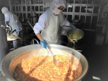 ケチャップ煮は、鶏肉・にんじん・たまねぎ・キャベツ・じゃがいも・グリンピースを使用し、トマトピューレやケチャップ等で味つけし仕上げています。