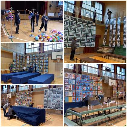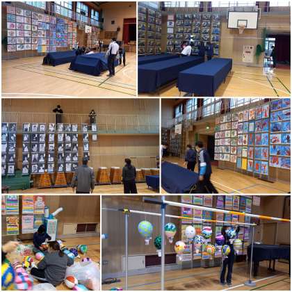 放課後、教職員が協力して作品展の準備に取り組みました。
