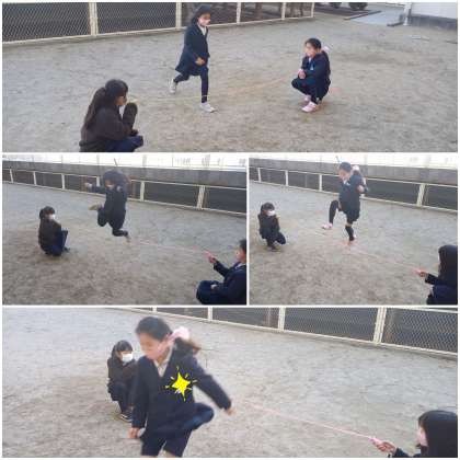とびなわを二本繋いだものを、低い位置から順に高さを上げていき跳んでいます。