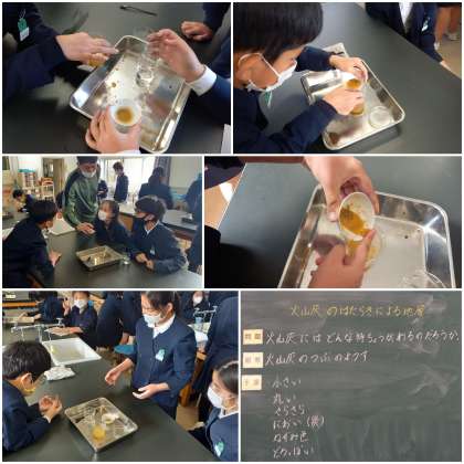 火山灰には、どのような特徴があるのかを調べています。