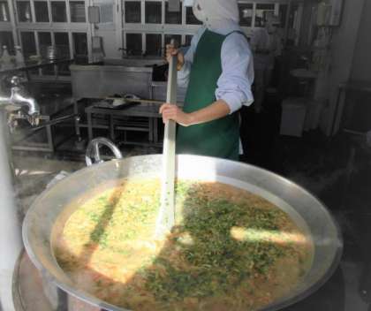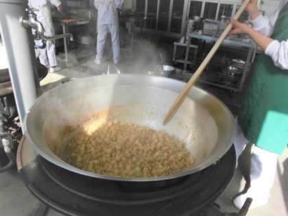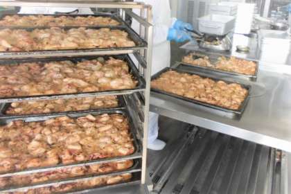 鶏肉の甘辛焼きは、鶏肉に料理酒・砂糖・みりん・こいくちしょうゆで下味をつけ、たまねぎを混ぜ合わせ焼き物機で焼いています。ごはんがすすむ味に仕上がっていました。