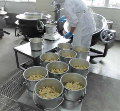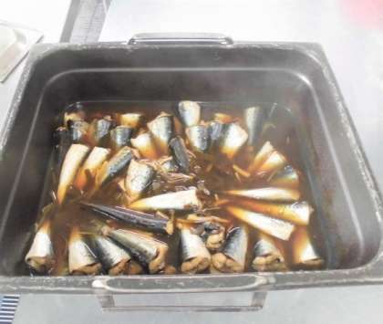いわしのしょうが煮は、一人二尾のいわし・しょうが・切りこんぶ・調味液とともにミニバットに入れ、焼き物機で煮ます。しょうがの風味がきいていて、いわしの身もふっくらしていました。