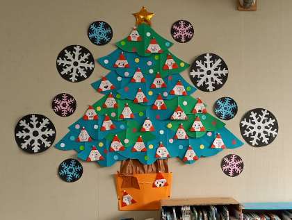 2年生の教室の壁面に、ステキなクリスマスツリーを見つけました。