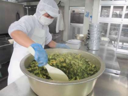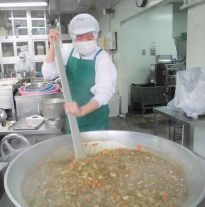 冬野菜のカレーライスは、しょうが・にんにくを香りよくいため牛肉・たまねぎ・にんじん・だいこん・れんこんをいため、煮込んでいます。野菜が煮込まれて児童もたくさん食べていました〜。