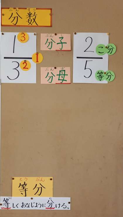 2学級を3分割して、分数のたし算・ひき算の学習に取り組んでいます。