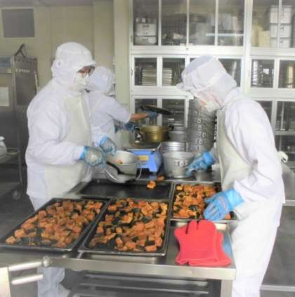 焼きかぼちゃの甘みつかけは、焼き物機でかぼちゃを焼き、砂糖・塩・こいくちしょうゆで作ったみつをかけています。