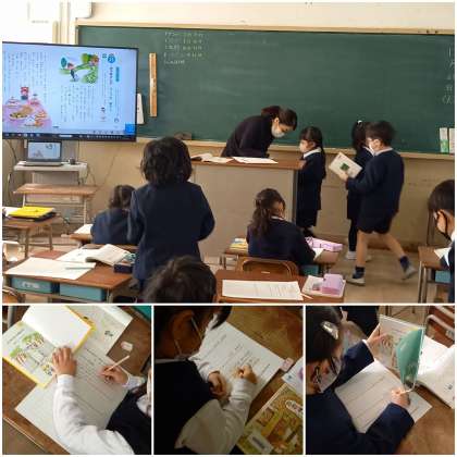 子どもたちが、自分の好きなお話をしょうかいするための「紹介文」を書いています。