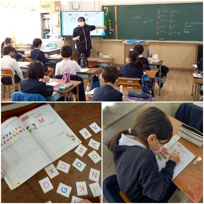 自分の名前や、友達の名前のイニシャルを練習しています。