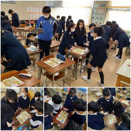 先生が読み上げた「アルファベット」を、教科書の中から探しています。