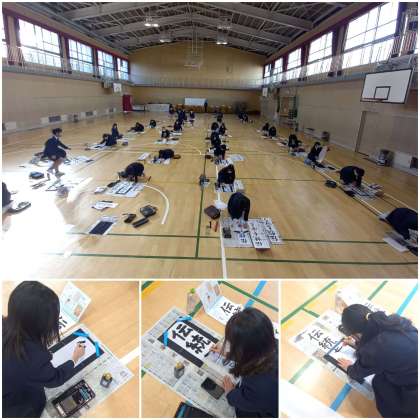 講堂で、六年生が書初めに取り組んでいます。
