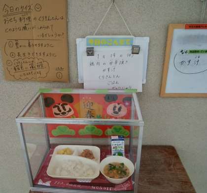 『鶏肉の甘辛焼き、かす汁、くりきんとん、ごはん、牛乳』です。
