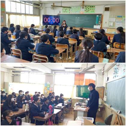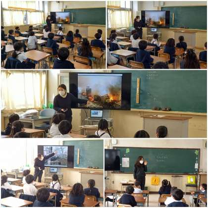 1年生の教室では、地震により火災が発生した際の写真や、地盤が傾き電車が線路から落ちている写真などを見ながら地震が起きた時の避難の仕方について話を聞いていました。