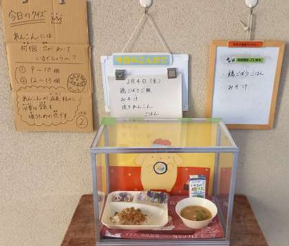 今日の献立は、『鶏ごぼうご飯、みそ汁、焼きれんこん、牛乳』です。