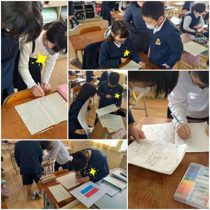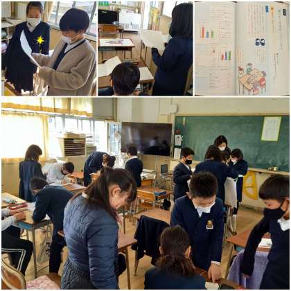 友達にアンケートをとり、まとめたことを報告する練習をしています。