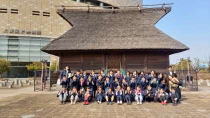 高床倉庫をバックに記念撮影。