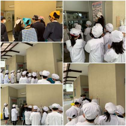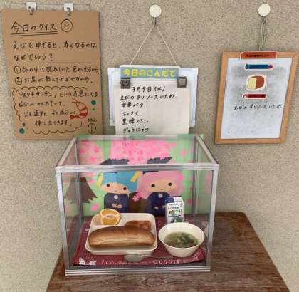 今日の献立は『えびのチリソースいため、中華がゆ、はっさく、黒糖パン、牛乳』です。
