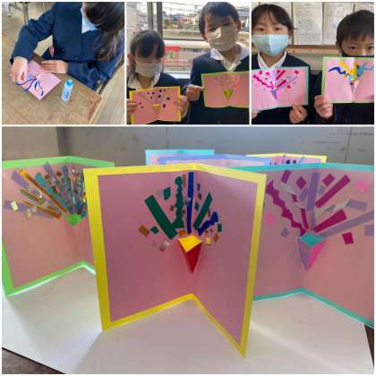 1年生が、瓜破北幼稚園の園児さんに1年間の交流のお礼に『とびだすカード』を作りました。