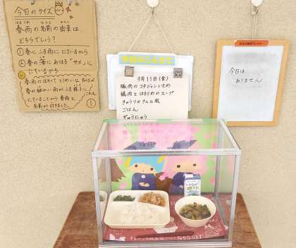 今日の献立は、『豚肉のコチジャンいため、鶏肉とはるさめのスープ、きゅうりのナムル風、ご飯、牛乳』です。