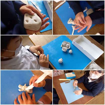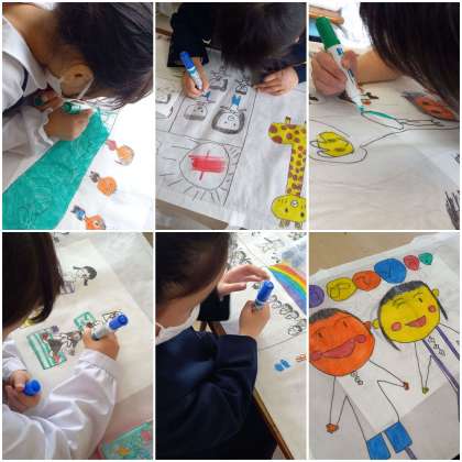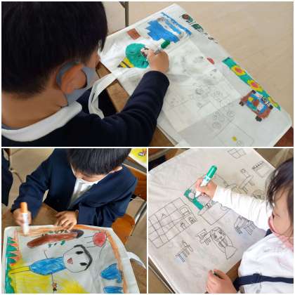粘土遊びをしていたり、作品袋に絵を描いていたりと楽しんでいます。