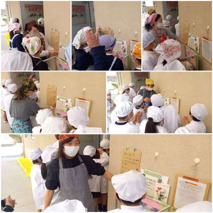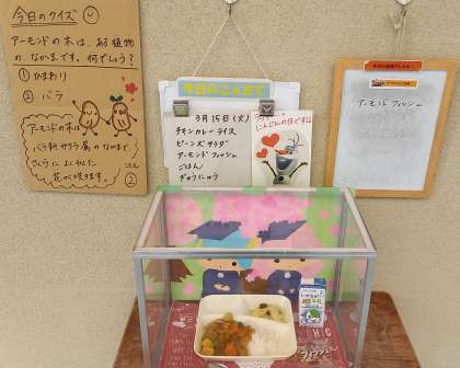 今日の献立は、『チキンカレーライス、ビーンズサラダ、アーモンドフィッシュ、牛乳』です。