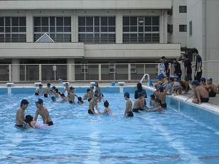 5年生が幼小連携の一環で、瓜破北幼稚園のあお組園児とプールで交流しました。