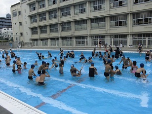 一緒に準備体操をした後、シャワーを浴び、プール遊びをしました。