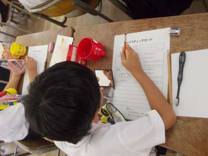 コップと歯ブラシを持参して、正しい歯の磨き方を学びました。