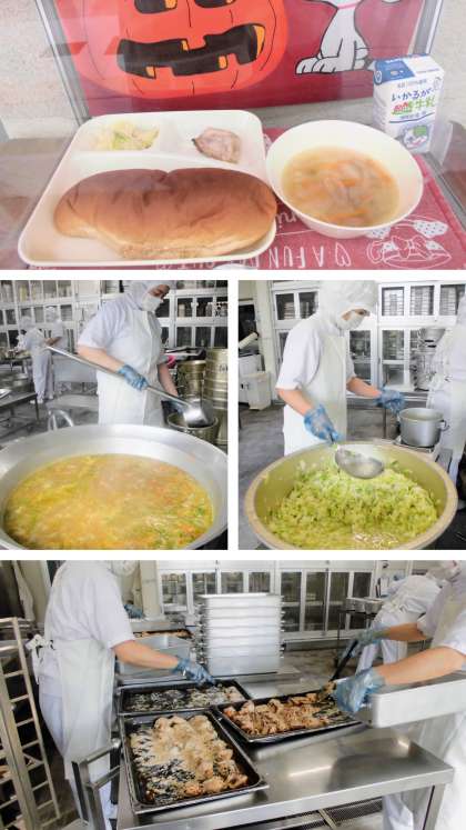 献立は、かつおのガーリックマリネ焼き【ノンエッグドレッシング】・ウインナーとじゃがいものスープ・キャベツのサラダ・黒糖パン・牛乳でした。