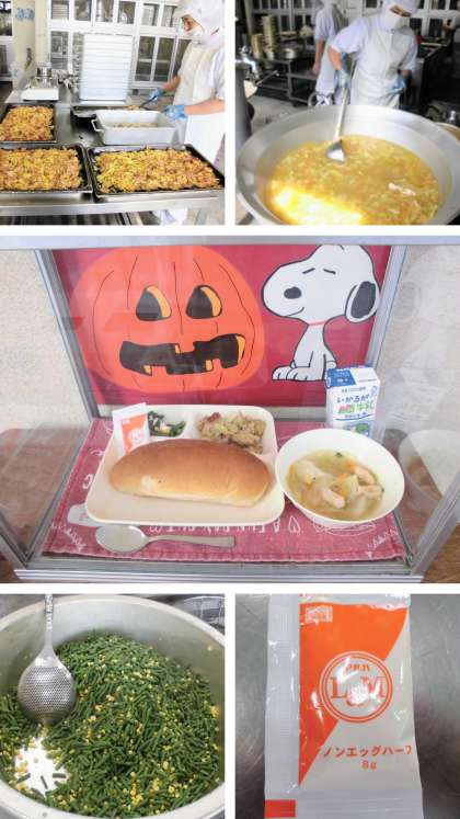 献立は、豚肉のカレー風味焼き・鶏肉と野菜のスープ・さんどまめとコーンのサラダ【ノンエッグドレッシング】・レーズンパン・牛乳でした。