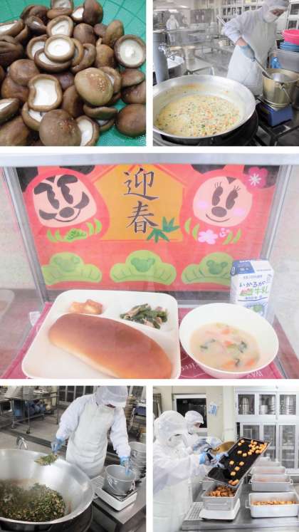 はくさいのクリーム煮は、鶏肉・はくさい・たまねぎ・チンゲンサイ・にんじん・生しいたけを使用し、牛乳とクリームを加えて煮、でんぷんでとろみをつけた中華風のクリーム煮で、寒い日にぴったりの献立でした。