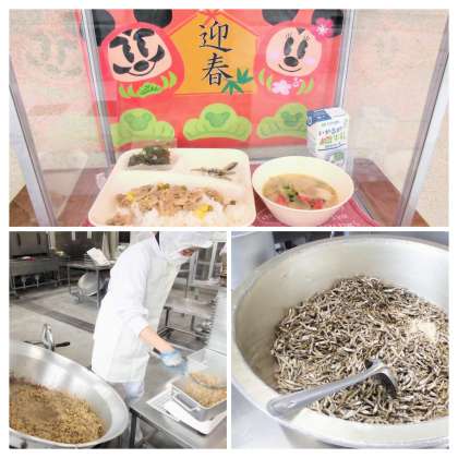 献立は正月の行事献立で、れんこんのちらしずし・ぞう煮・ごまめ・ごはん・牛乳でした。