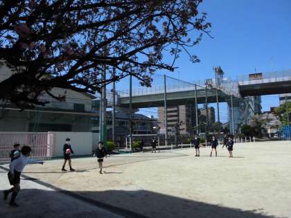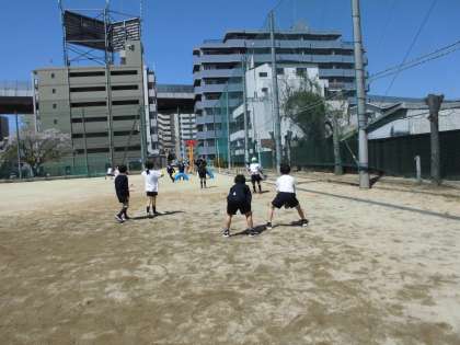 小春日和の温かい陽気に包まれ、子どもたちは休み時間は運動場で元気よく遊んでいます。桜の木の下で、ボール運動を楽しむ子どもたち。晴れた日は運動場でしっかり外遊びができています。