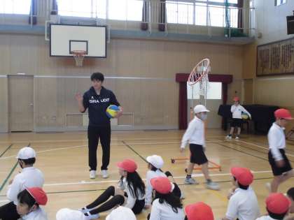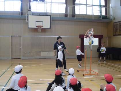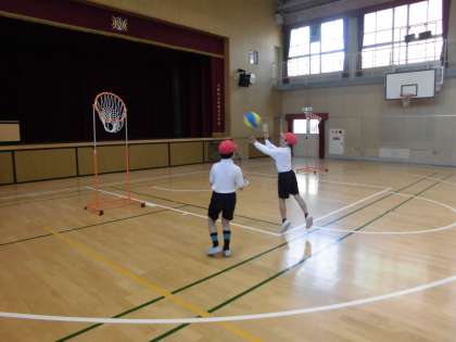 4年生は、講堂でセストボールをしました。セストボールは、パスをつないでボールを運び、ゴールにシュートをして得点を競い合うゴール型ゲームです。今日は、2人ペアでパスをしながら、ゴールに入れる練習をしていました。上手にシュートできると「よっしゃ」という喜びの声を上げてとても楽しんでいました。