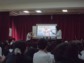 巷にあふれる危険な薬物にはどんな種類があるのかや、薬物乱用による心身への影響について学びました。薬物から自分を守るために、友だちなどから勧められた時の断り方も考え、ロールプレイも行いました。