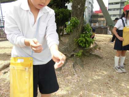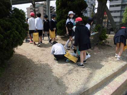 3年生は理科で春の生き物を探しました。パンジー、ビオラ、菜の花など学校には、今様々な植物が花を咲かせています。暖かくなって虫たちも出てきています。子どもたちは「ダンゴムシや」「ゾウアリがいた」と言いながら捕まえていました。ワークシートには見つけた生き物の名前を書きました。