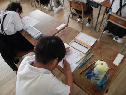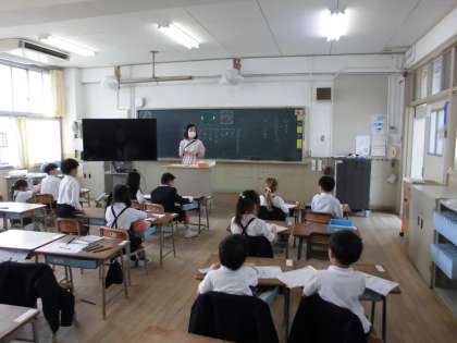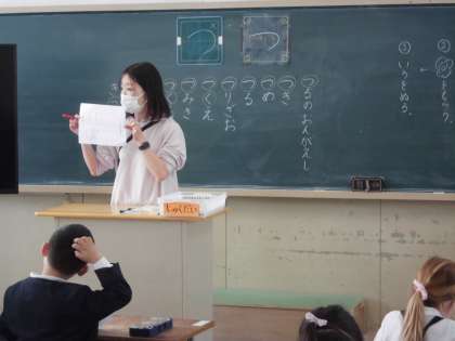 1年生は国語でひらがなの学習を始めています。はじめは、一筆で書くことのできる「く」「し」「つ」といった文字から学習します。今日は「つ」を丁寧に書いていました。「つ」の付く言葉もたくさん見つけることができました。