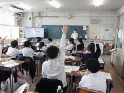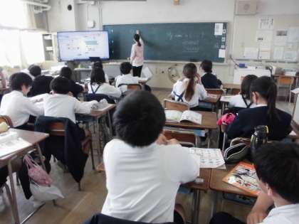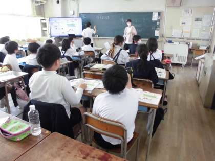 5年生は英語で「My name is 〇〇」と、英語で自分の名前を書いてみるとどうなるか学習していました。先生が、クイズ形式で、スペルの順番を入れ替えて黒板に英文字を書くと子どもたちは「簡単や」とか「長い名前にして」など言いながら、楽しく答えていました。正解すると、ガッツポーズや拍手がおこっていました