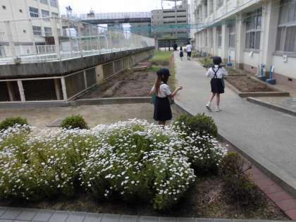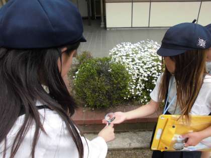 3年生は校内で生き物や植物を探しています。子どもたちはダンゴムシが大好きです。手に取って平気な子もいれば動き出すと「きゃー」と言って逃げる子どももいます。虫眼鏡片手に植物や生き物を見つけてしっかり観察できました。
