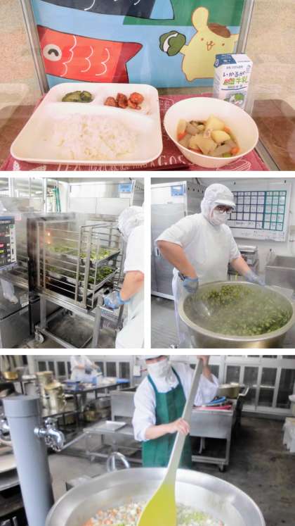 献立は、まぐろのオーロラ煮・豚肉と野菜の煮もの。きゅうりの赤じそあえ・ごはん・牛乳でした。