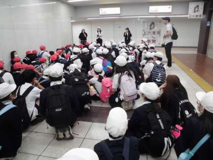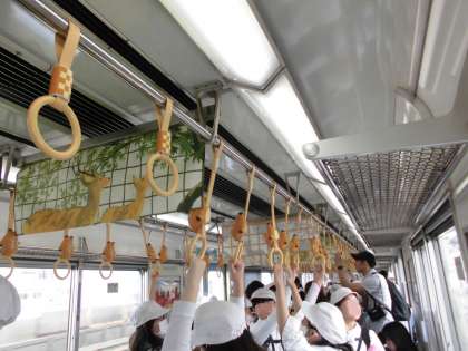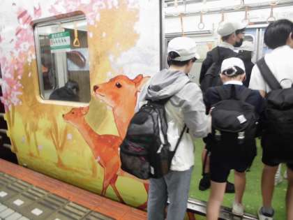 5年生と6年生は奈良の平城京跡歴史公園へ行きました。地下鉄と近鉄奈良線に乗りました。行きに乗った電車は、ラッピング列車「ならしかトレイン」でした。シートが鹿の模様になっていたり、つり革が鹿のフィギアだったりと、いたるところに鹿がいる楽しい列車でした。