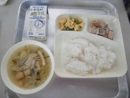 今日の給食は、さけのゴマみそ焼き、五目汁、えんどうの卵とじでした。五目汁は具沢山であっさりとしておいしかったです。えんどうの卵とじはあま口でとてもやさしい味でした。