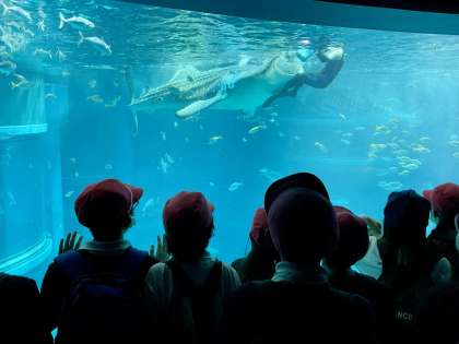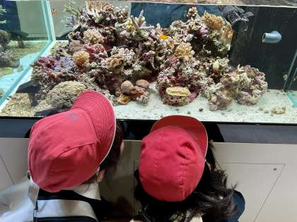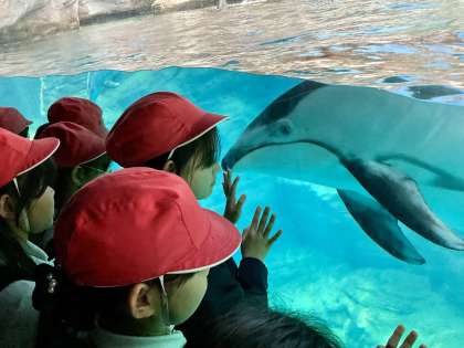 イルカが子どもたちの顔のすぐ近くまできて、とても喜んでいました。サンゴのたくさんある水槽ではニモ(クマノミ)が泳いでいるをじっくり見ました。ジンベエザメの餌やりでは大きな口で餌を食べる姿も見ることができました